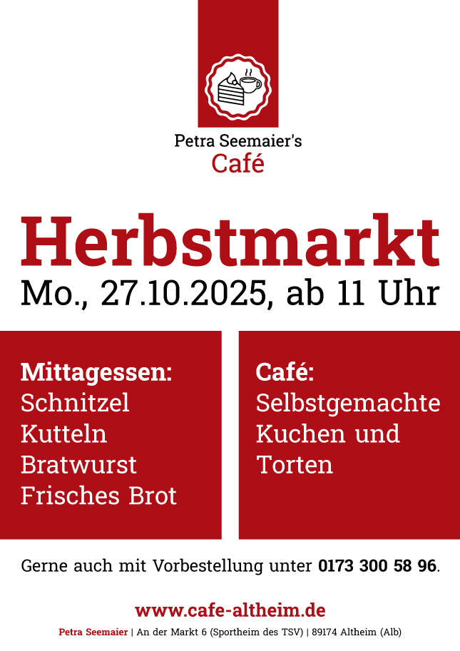 In Petra Seemaier’s Café genießen Sie die Idylle auf der Schwäbischen Alb mit hausgemachten Kuchen und Torten aller Art sowie leckeren Kaffeespezialitäten und wechselnden Gerichten der Saison. In den wärmeren Monaten lädt unsere große Terrasse zum Verweilen ein.